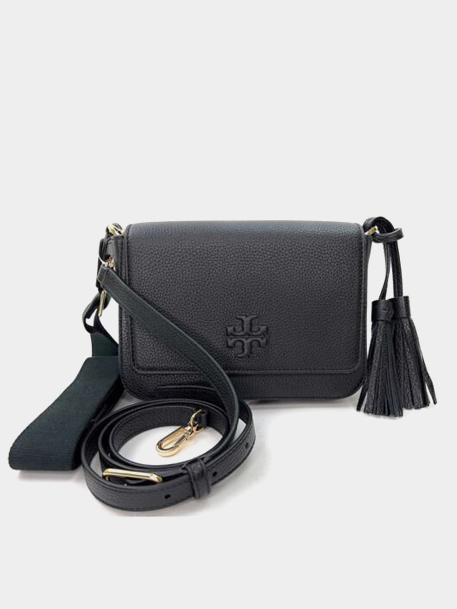 Tory Burch Thea Web Flap Crossbody In Black Pebbled Leather